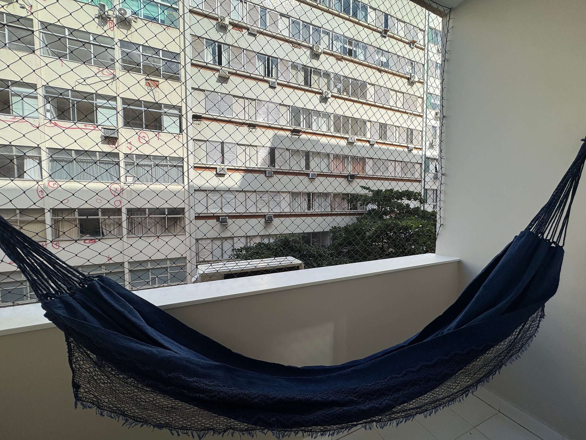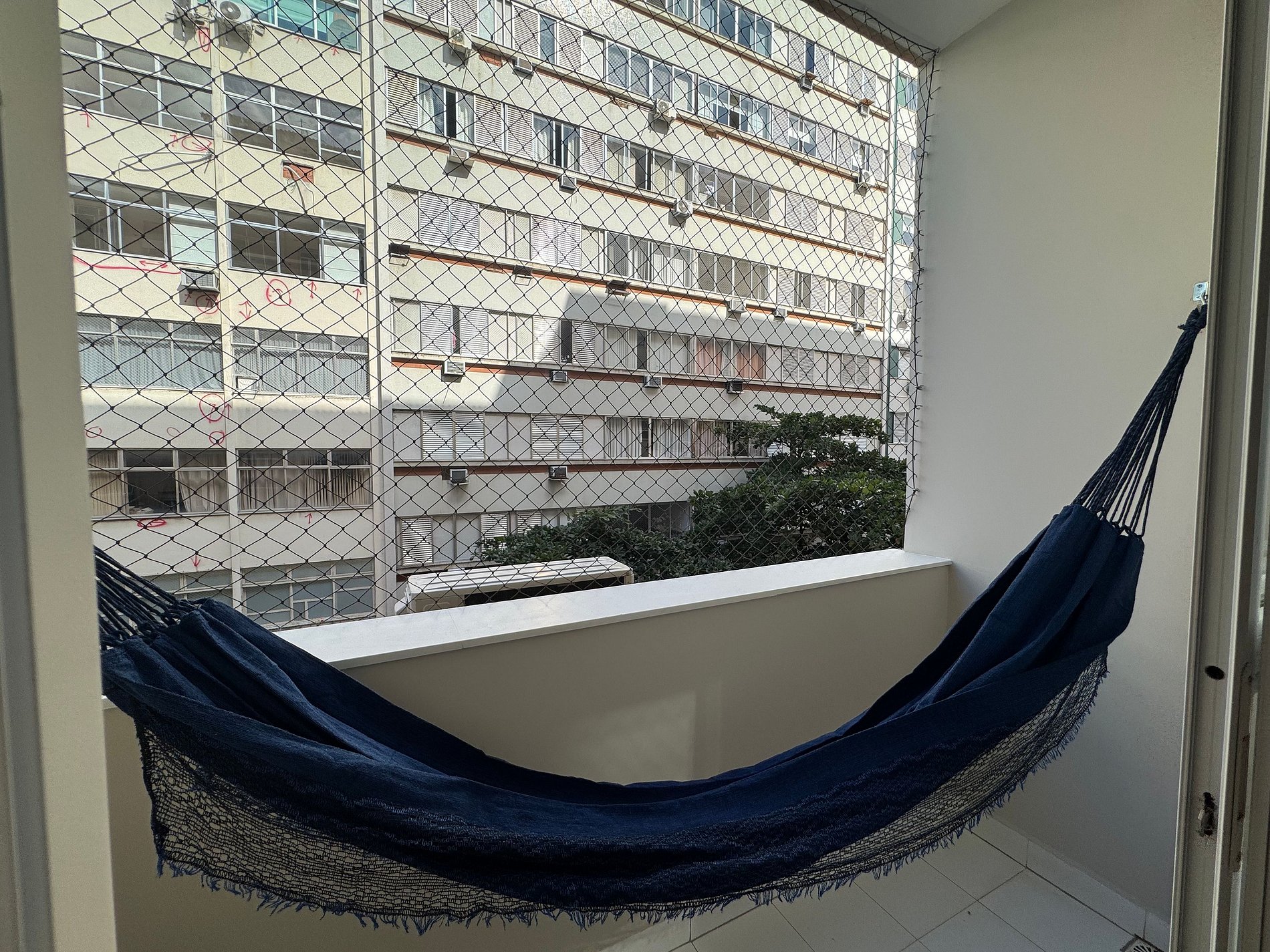 Varanda com rede e vista relaxante.