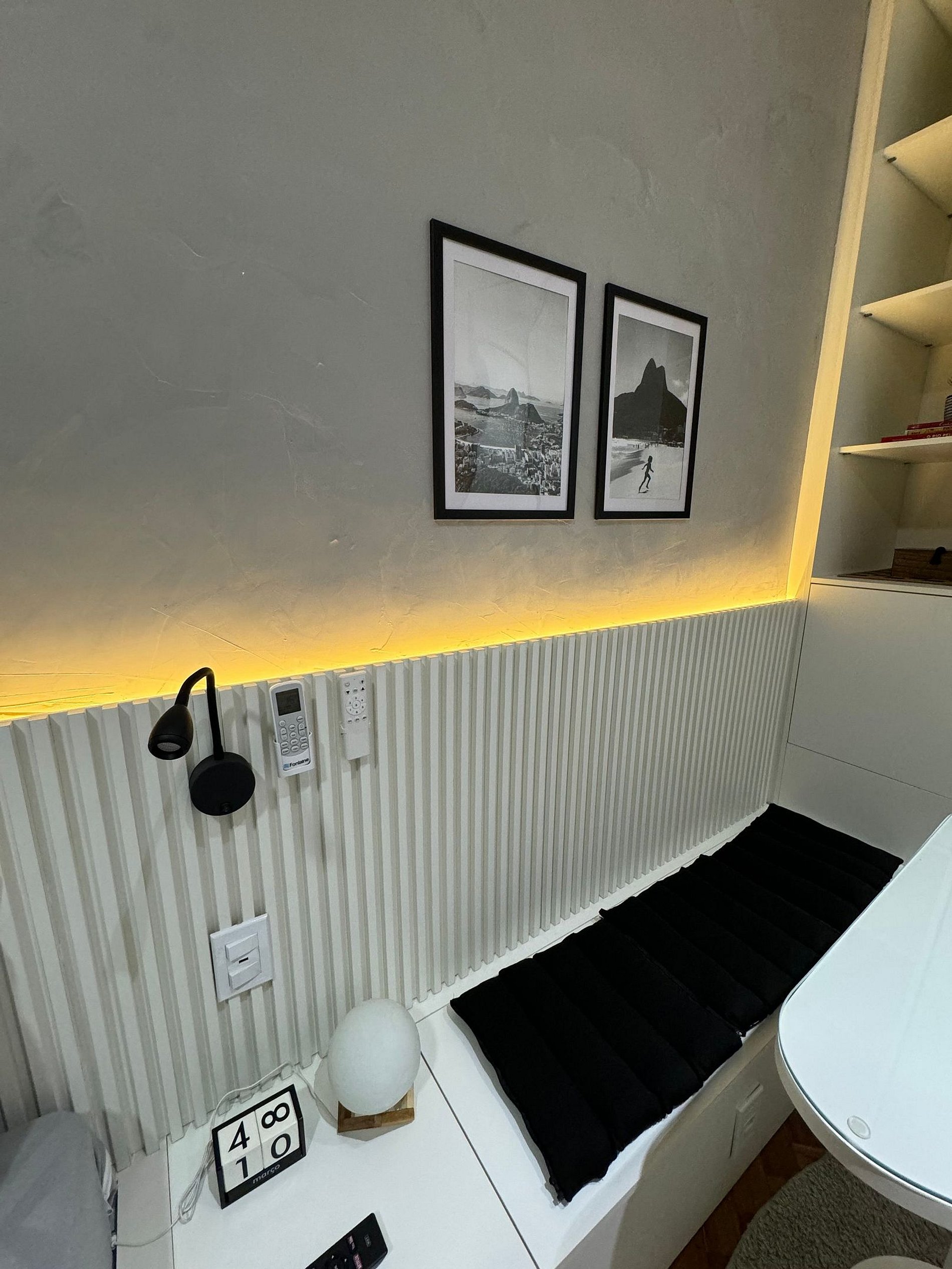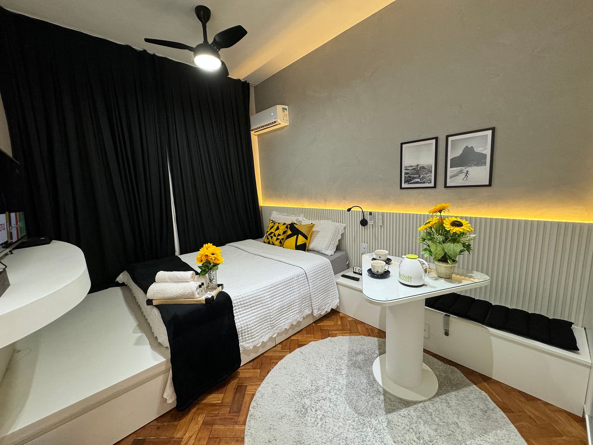 O estúdio possui ar-condicionado, proporcionando um ambiente fresco e agradável mesmo nos dias mais quentes do Rio.