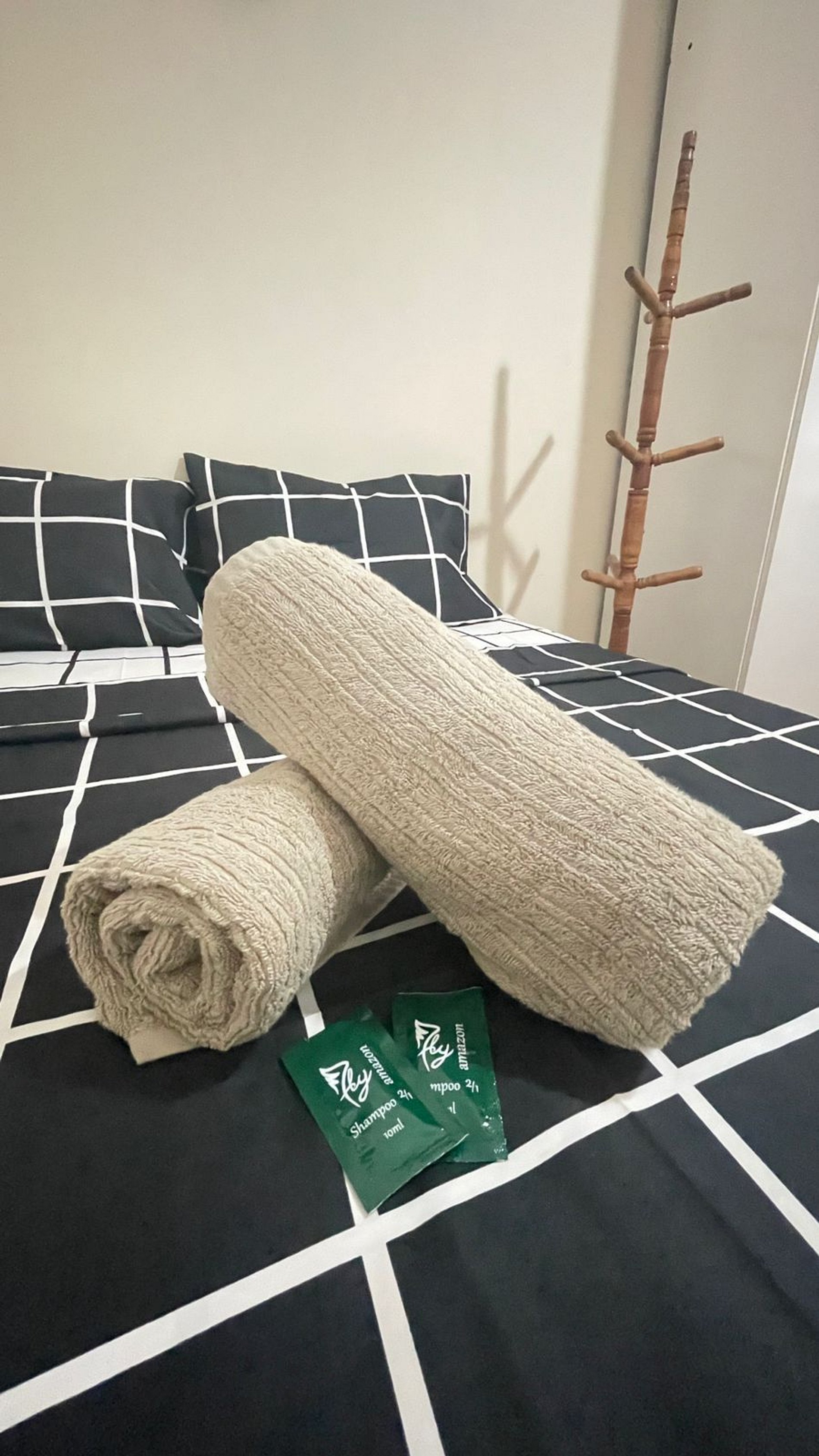O apartamento conta com dois quartos aconchegantes, ambos com ar-condicionado, guarda-roupas espaçosos e roupas de cama limpas e macias.